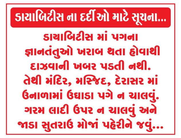 ડાયાબિટીસમાં “નાની બાબત” પણ મોટી સમસ્યા બની શકે છે. પગની કાળજી અવગણશો તો તેનું પરિણામ ગંભીર હોઈ શકે છે. સાવચેત રહો, નિયમિત તપાસ કરાવો અને યોગ્ય ફૂટવેરનો ઉપયોગ કરો.